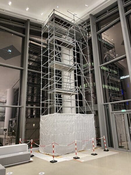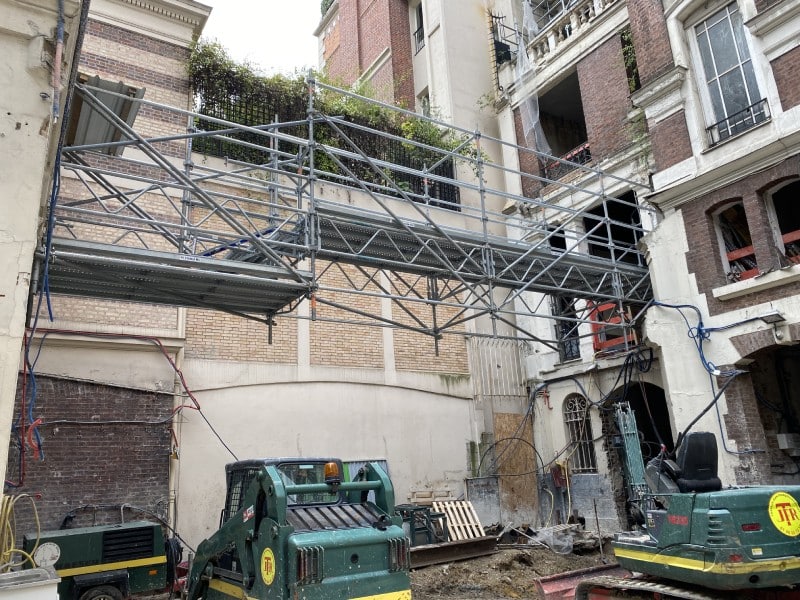 Pour la réparation du plafond de l’institut Imagine (Hôpital Necker), une structure auto-stable en échafaudage a été montée pour former un platelage en dessous de la totalité du plafond.
