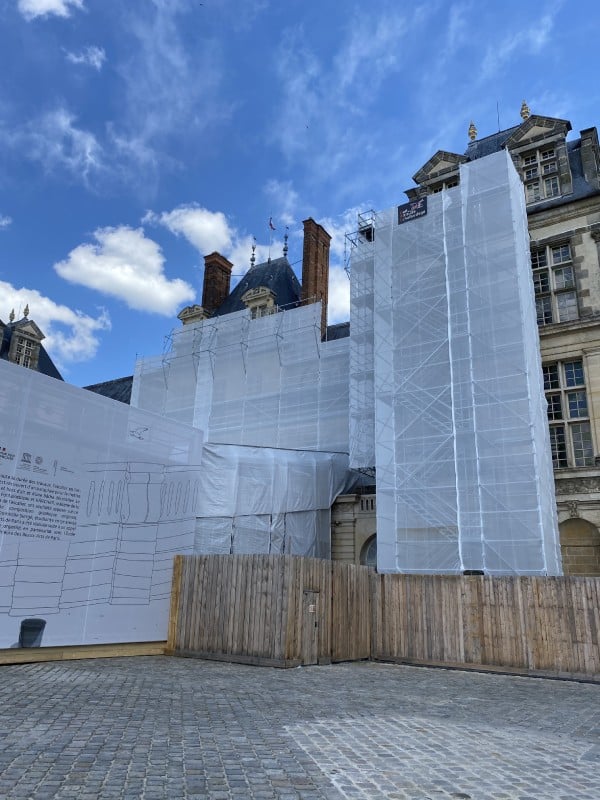 – un échafaudage pour couvreur de 45 mètres de long pour une hauteur de 18 mètres de haut avec les retours sur rue et toitures.