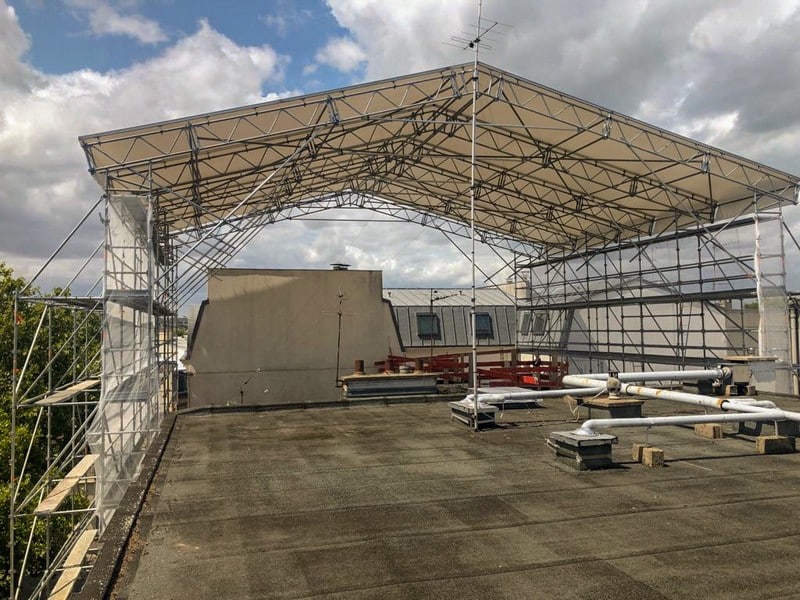 Pour le remplacement de la toiture d’un groupe scolaire à Montreuil, plusieurs échafaudages pour couvreur ont été montés.